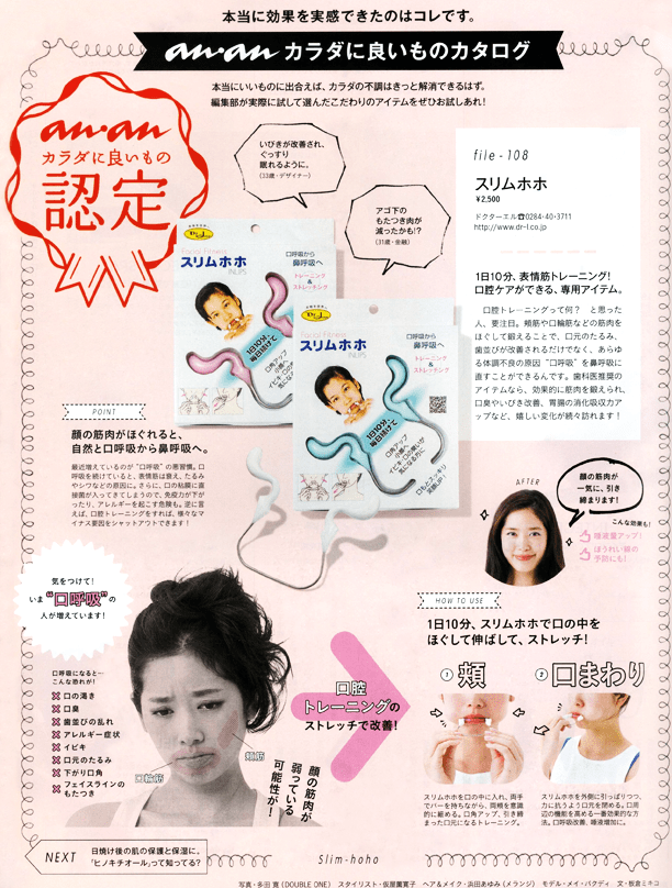 今まではホホを引き締まった状態に維持させることは外側からのマッサージ以外方法はありませんでした。そこで開発したのがホホを内側から鍛え和らげる器具、スリムホホでした。